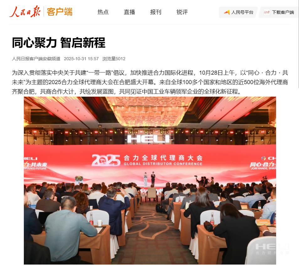 10月28日至31日,“同心?合力?共未來”2025合力全球代理商大會在合肥召開,引發(fā)媒體廣泛關注,新華社安徽分社、中央廣播電視臺安徽總站、經濟日報、證券日報、央廣網、中國工業(yè)報、人民網安徽頻道、新華網安徽頻道、安徽日報、安徽新聞聯(lián)播等28家媒體、46名記...